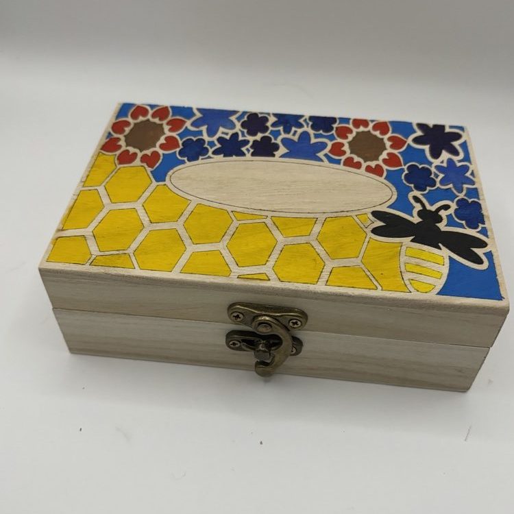 After the first attempt I decided to cover the top with masking tape and then after multiple attempts at scoring through the tape I got down to the level that the wood was also scored. Picking out the scored now cut pieces of tape allowed me with my very limited painting skills to colour different sections of the box whilst retaining an etched wood outline.