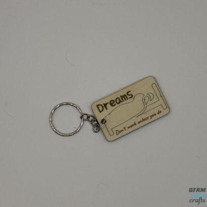 Key chain with a wooden tag and the words