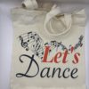 Small canvas tote bag approximately 30cm x 35cm(59cm inc. handles) with the wording Let’s Dance and scrolling musical notes image.