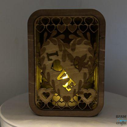 Add a touch of charm and romance to your multi-lantern light box with this 3mm Basswood Ply Insert. Designed with precision and crafted from high-quality basswood, this insert features an intricate heart fretwork design that exudes elegance and warmth. The centerpiece showcases an engraved cupid and the word “LOVE” in a beautifully lasercut style, creating a perfect blend of artistry and sentiment.