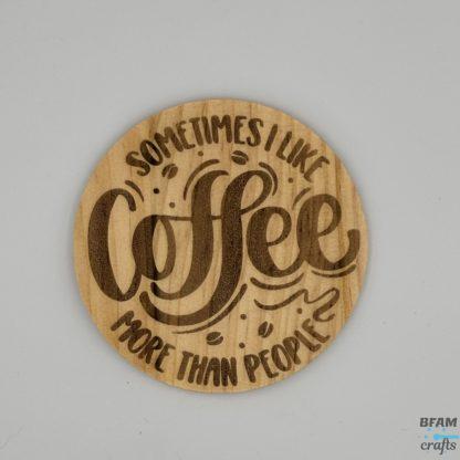 Wooden coaster engraved with “Sometimes I like Coffee more than people”.