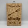 Upgrade your kitchen with this stylish and functional bamboo chopping board, featuring a laser-engraved design that reads “What the [fork icon] for dinner”.